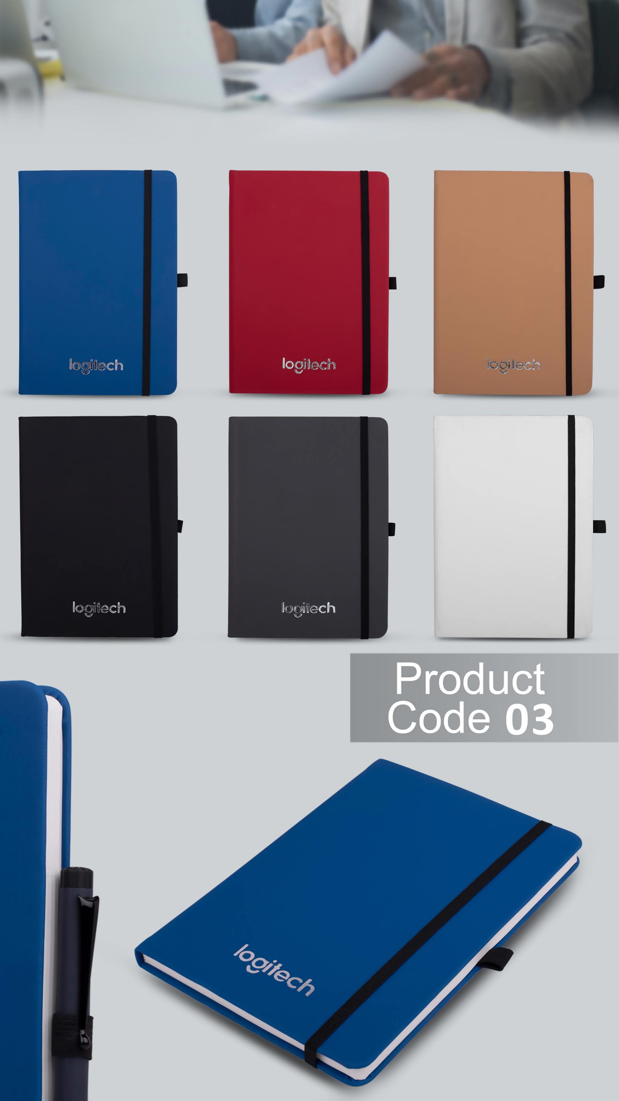 Soft-Touch PU notebook (catalogue code 03) β an A5 corporate gifting notebook from Gifts Gulf. A5 notebook with elastic closure and pen loop; slim profile. Every notebook ships with 192 pages of 80 gsm ivory ruled paper, elastic closure (where applicable), and a ribbon marker. The cover is 100% vegan PU leatherette β durable, water-resistant, and fully brandable. Branding options on the front cover: UV print (photo colour), laser engraving, blind / silver / gold embossing, foil stamping, and screen print. Full print area is 150 x 190 mm. Pantone colour matching available. Available colourways: Blue, Red, Tan, Black, Grey, White. Minimum order 50 pieces. Lead time 10-14 days from artwork approval. GST invoice, pan-India logistics, and custom gift-box packaging included.